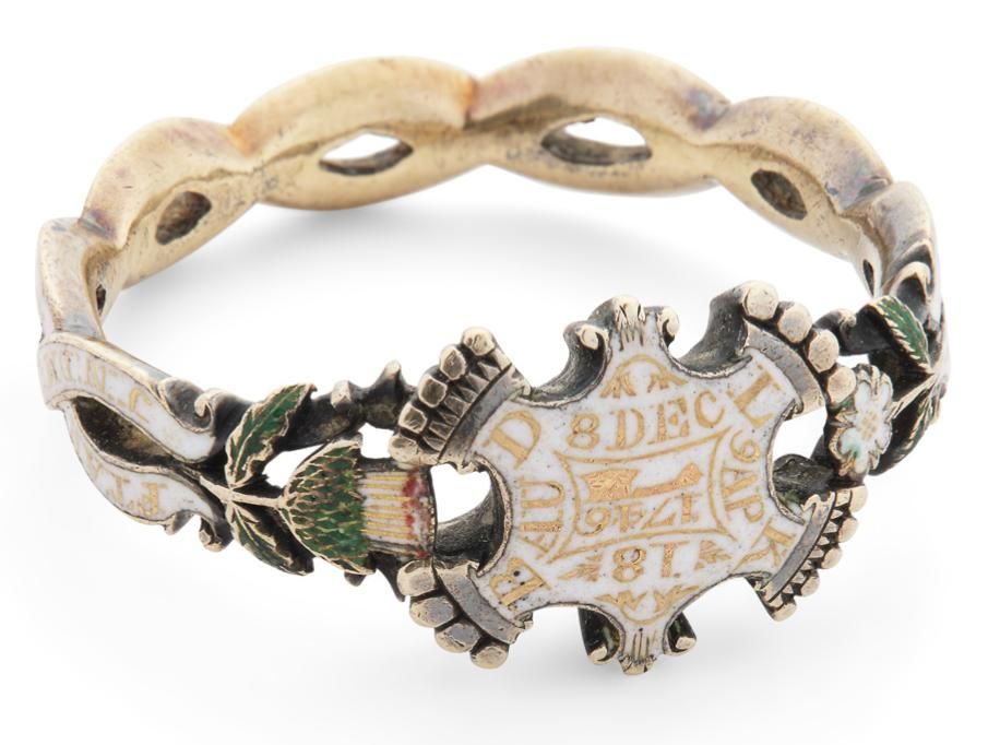 Given the superb quality of this ring it is thought to have been crafted by Edinburgh Goldsmith and Jacobite sympathiser Ebaneezer Oliphant. It is one of a small number of Jacobite rings that feature a Thistle and Rose on the shoulder.