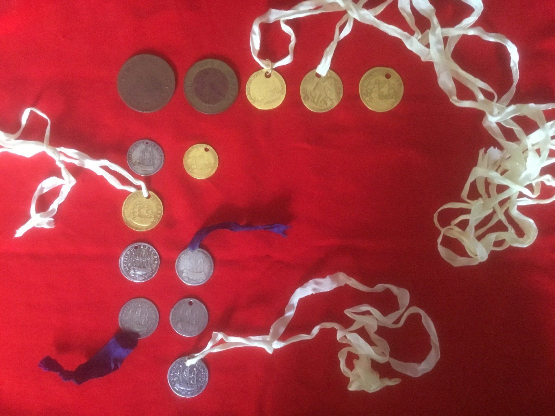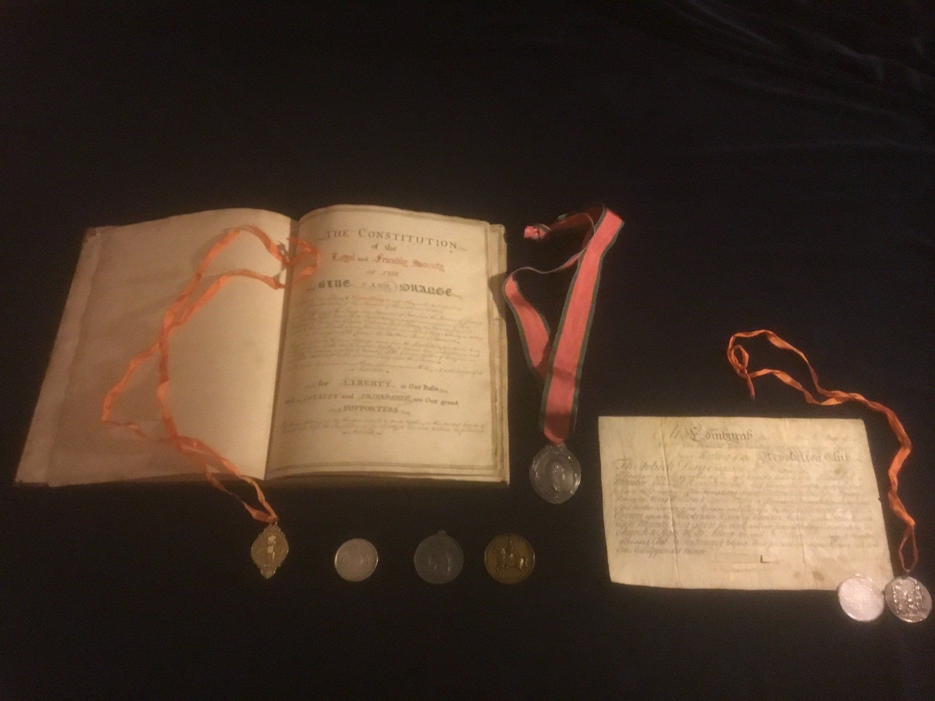 Ther Loyal and Friendly Society of the Blue and Orange, constitution book and gold medallion, Friendly Society medal, Volunteer Regiments medal, Loyal Orange medal, a trial strike of the Cumberland Society medal, The Edinburgh Revolution Club member's Diploma and silver medals. This society met in a room in Blair Street off the High Street. They printed a song book so that members would know the words of the songs sung during their meetings.