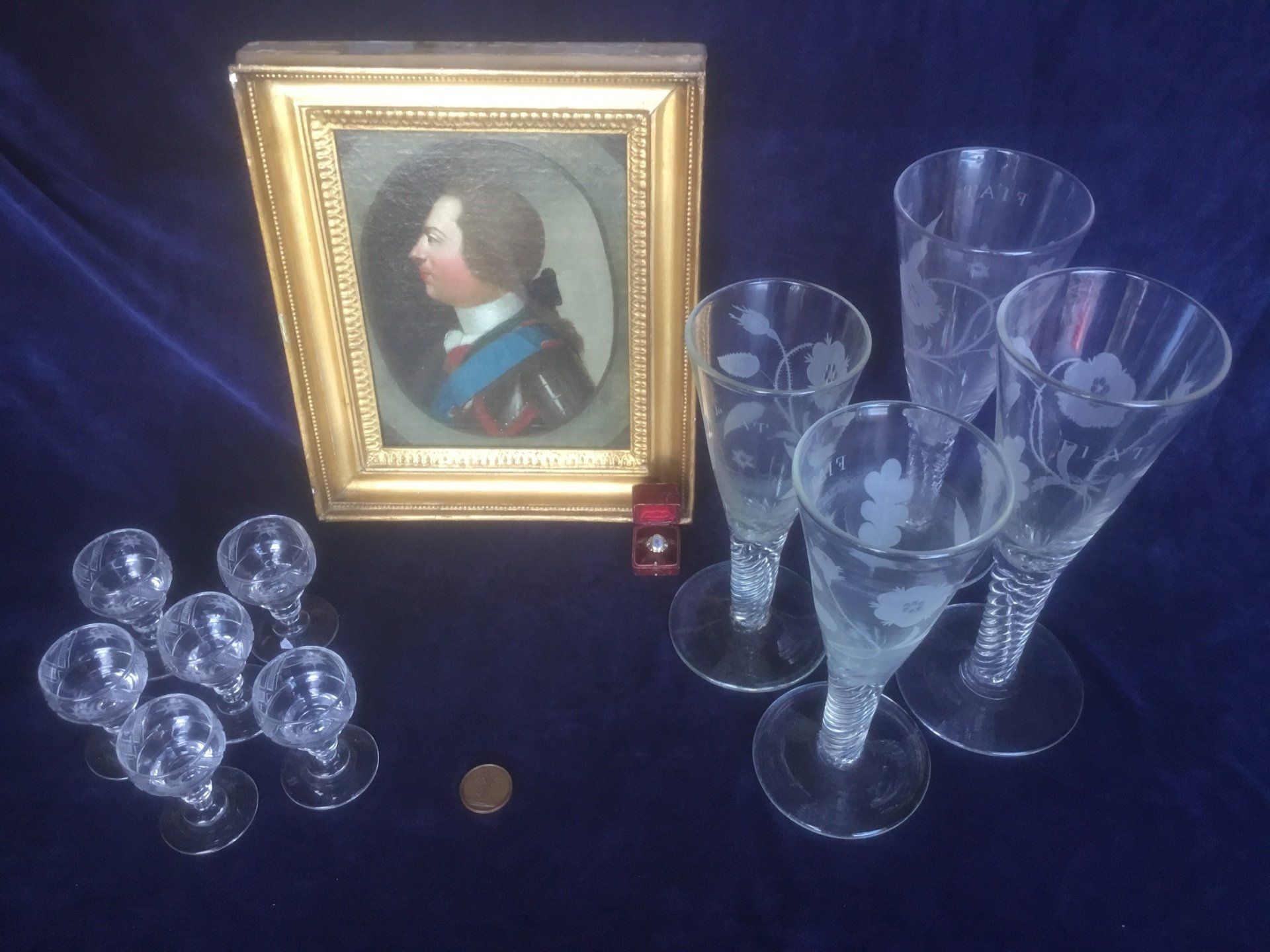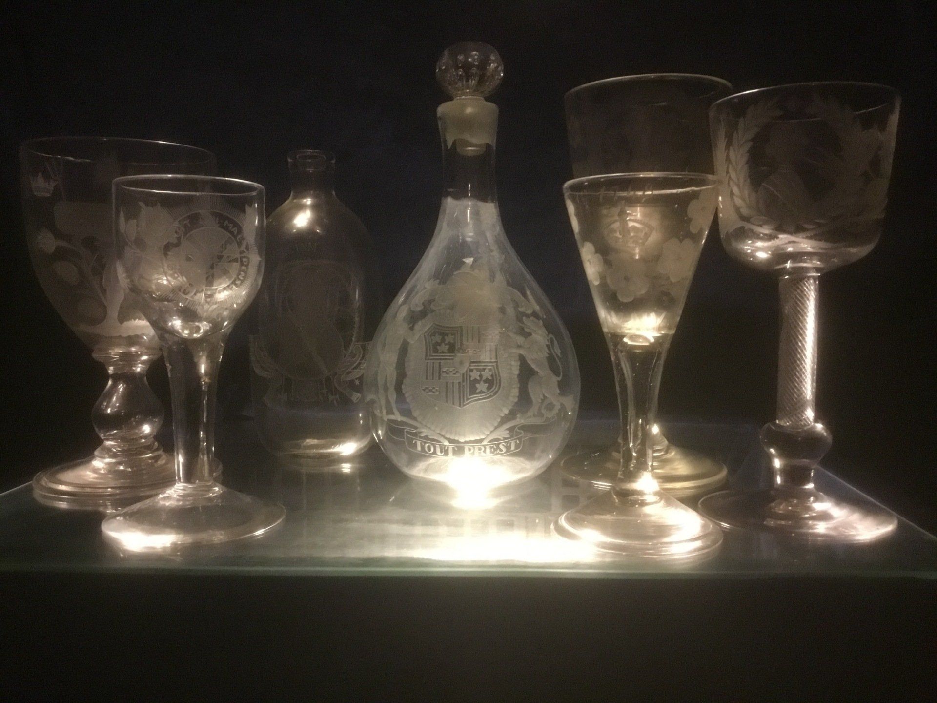 The Devil takes the House of Hanover, Garter star, Duke of Cumberland flask, Marquess of Tullibardine wine decanter, wine glass dated 1748, two Prince Charles portrait glasses.