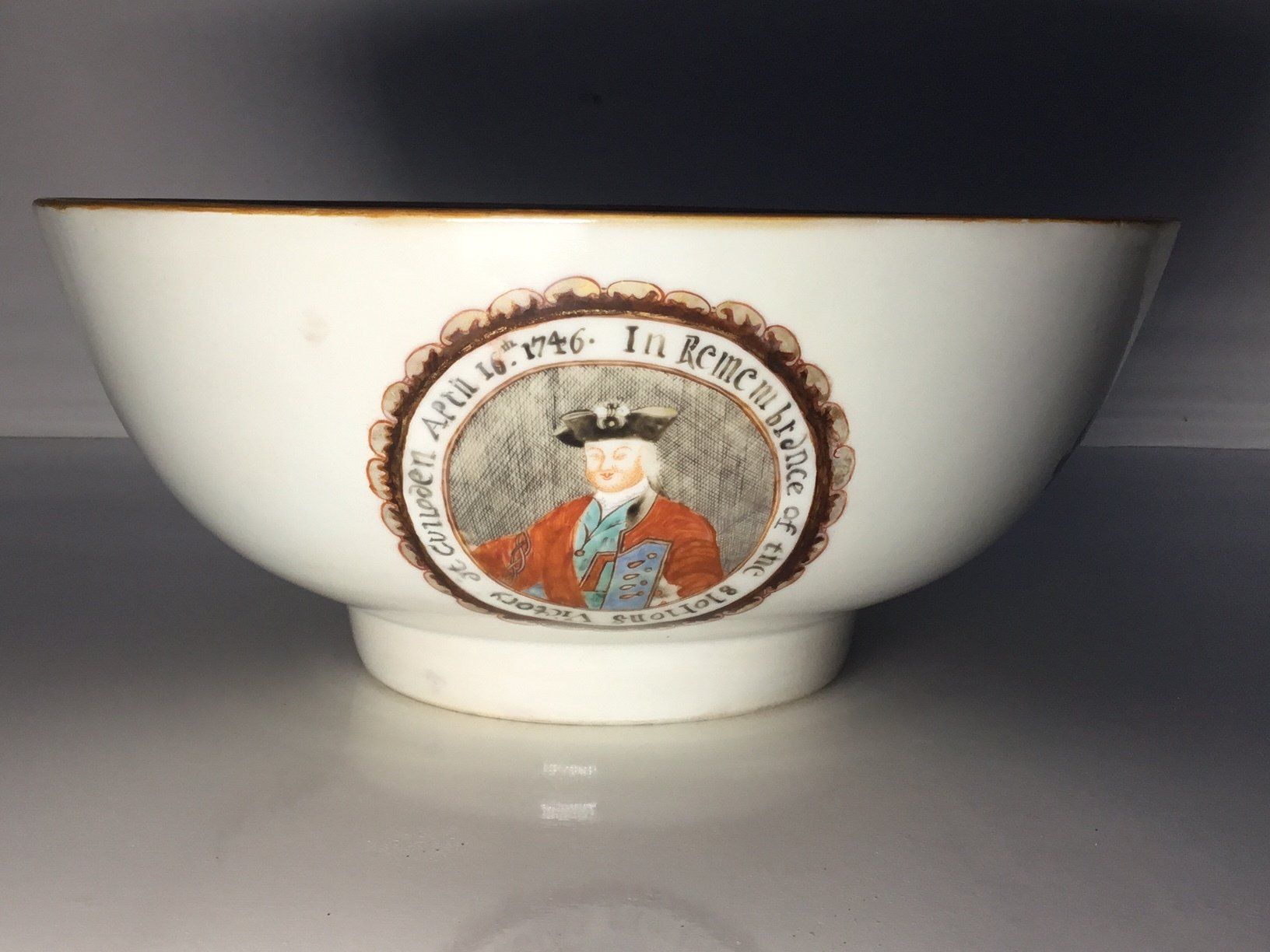 This punch bowl is an example of a mid eighteenth century Chinese Export Porcelain. It has an image of the Duke of Cumberland on the outside which is surrounded by the inscription 'April 16th 1746 in Remembrance of the Glorious Victory at Culloden'. On the inside there is an image of three swimming goldfish. It measeures 10 1/5'' across.