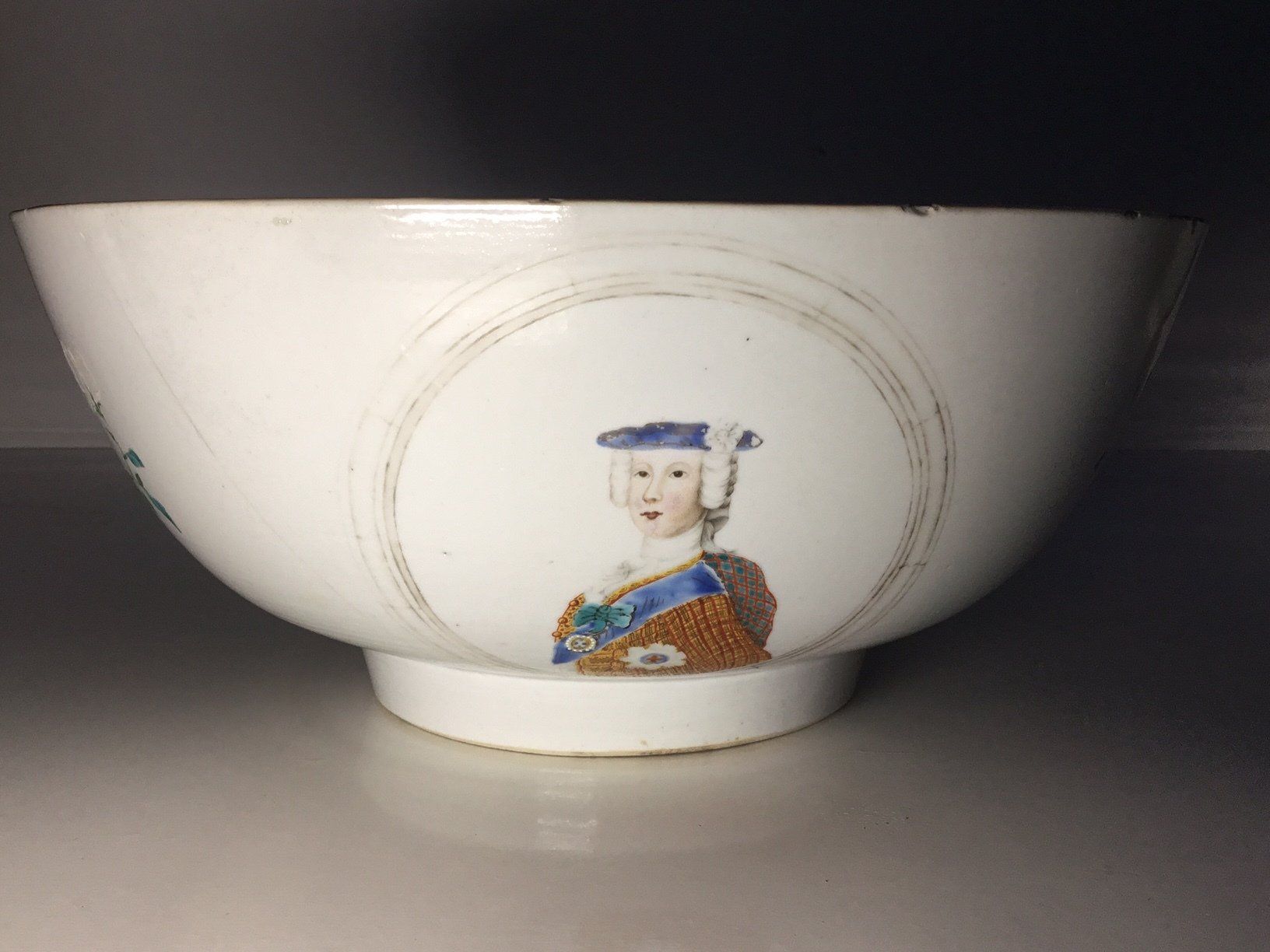 This is an extremely rare Qianlong-era, mid eighteenth century, punch bowl with a fine portrait of Prince Charles Edward on the outside. It has a white 'Jacobite' rose on the inside which is similar to the iconolgy more commonly used on Jacobite glasses. These images have been enamelled on top of the glaze which is an extremely demanding process. It measures 11'' across.