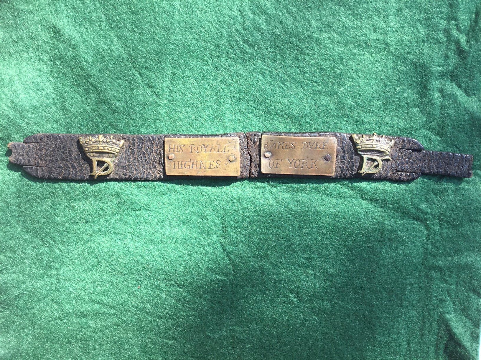 The collar is emblazoned with two Ducal crowns and with two plaques. One is engraved 'His Royal Highness' the other 'James Duke of York'. The collar would allow his dog to be identified during and after the hunt.