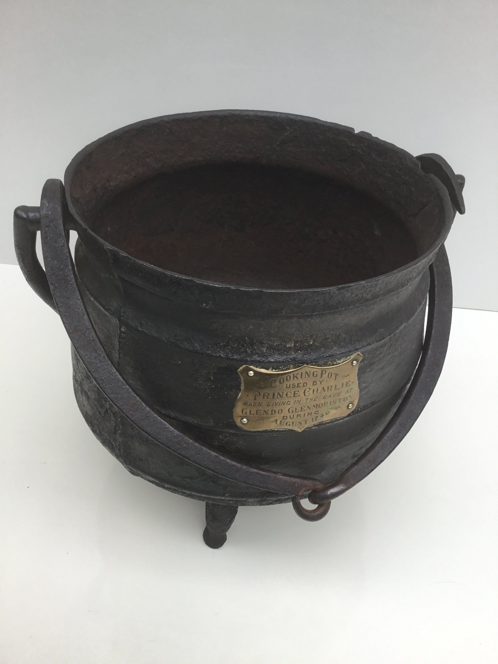This 17th century iron cooking pot was used by Bonnie Prince Charlie and the seven men of Glenmoriston in their famous hideout, the cave of Rory the Hunter, in 1746 while they were on the run from the Redcoats after the Battle of Culloden. The pot remained in the family of one of the men, Alexander MacDonald.