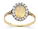 This ring is almost identical to a ring once owned by the Setons of Touch. The only difference is that this ring has 1745 enamelled after CPR. We now know the image of Prince Charles is taken from the Lemoyne bust created in 1747. This dates this ring to some time after 1747 but before 1766 when Charles became King and would no longer be known as CPR, Charles Prince Regent. There is a compartment below Charles’ image that contains a hair reputedly from Bonnie Prince Charlie.
