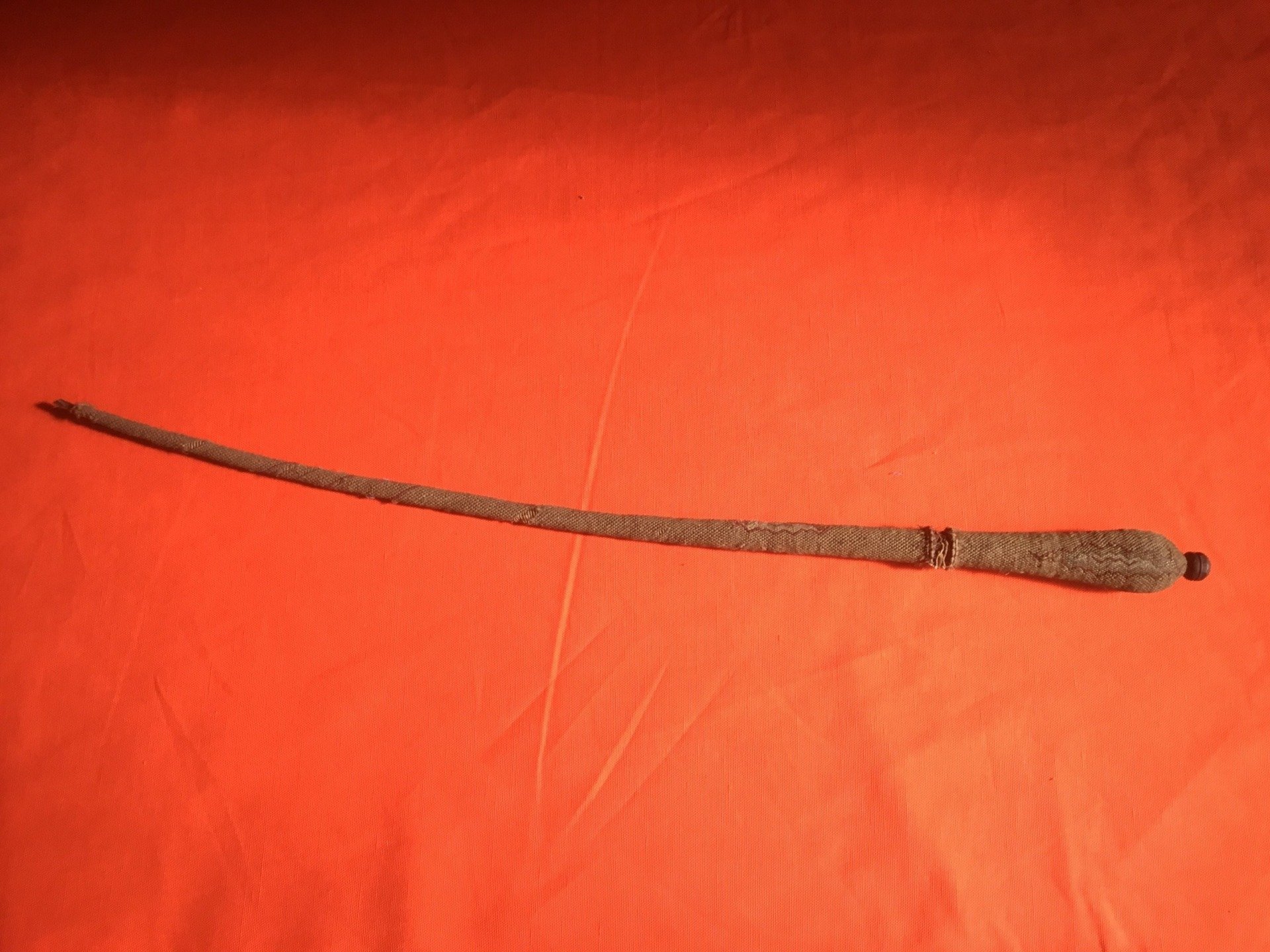 Although most of the colour has faded, the designs on the whip would have been bold and very bright. The cloth covers a length of wood.
