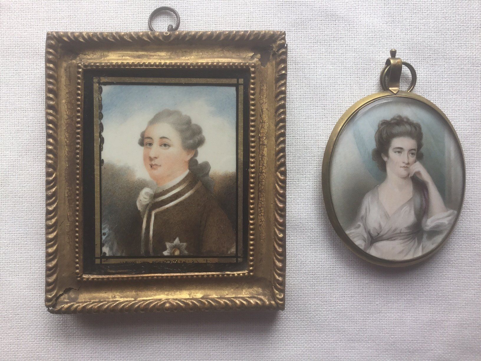 Oil on ivory miniature by Charles Dixon or Dickson. Dixon was a Jacobite goldsmith from Edinburgh who reinvented himself as a miniaturist during the 1745 uprising and painted Bonnie Prince Charlie; only to move to London and paint members of the Hanoverian Royal Family.